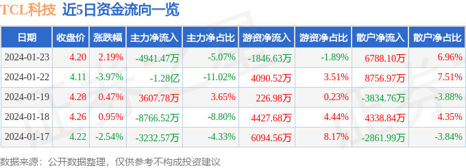 财经消息,截至2024年1月23日收盘,TCL科技(000100)报收于4.2元,上涨2.19%,换手率1.3%,成交量234.78万手,成交额9.75亿元。