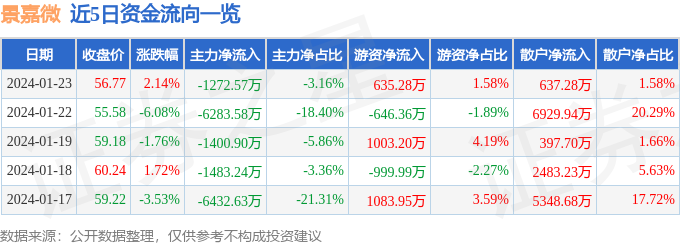 财经消息,截至2024年1月23日收盘,景嘉微(300474)报收于56.77元,上涨2.14%,换手率2.19%,成交量7.2万手,成交额4.02亿元。