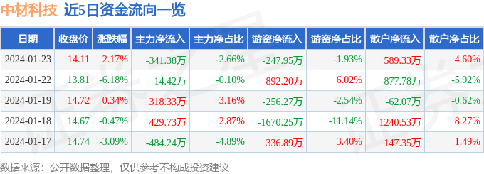 股票行情快报:中材科技(002080)1月23日主力资金净卖出341.38万元
