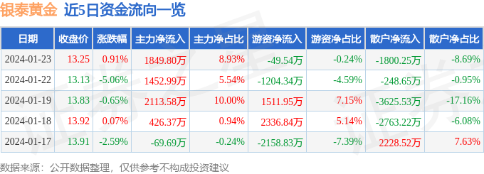 财经消息,截至2024年1月23日收盘,银泰黄金(000975)报收于13.25元,上涨0.91%,换手率0.63%,成交量15.76万手,成交额2.07亿元。
