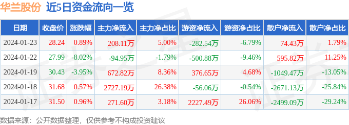 股票行情快报:华兰股份(301093)1月23日主力资金净买入208.11万元