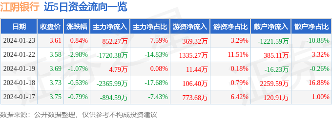 财经消息,截至2024年1月23日收盘,江阴银行(002807)报收于3.61元,上涨0.84%,换手率1.36%,成交量31.5万手,成交额1.12亿元。