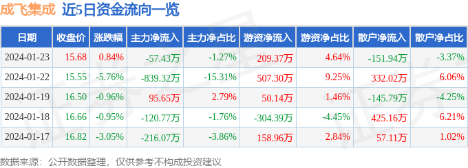 股票行情快报:成飞集成(002190)1月23日主力资金净卖出57.43万元