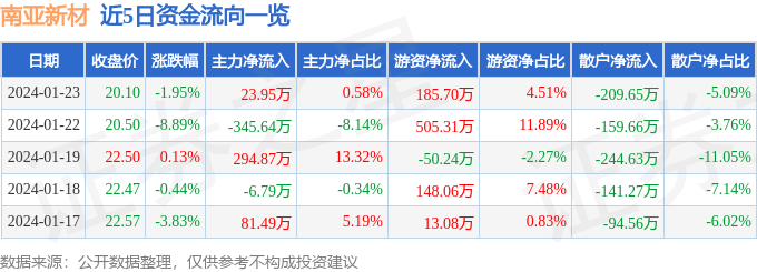 南亚新材(688519)1月23日主力资金净买入23.95万元
