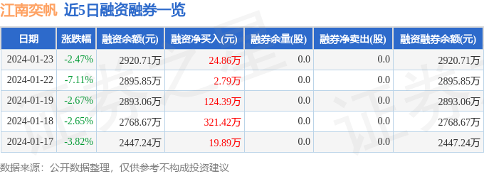 江南奕帆融资融券信息显示,融资方面,当日融资买入170.31万元,融资偿还145.45万元,融资净买入24.86万元,连续3日净买入累计152.04万元。融券方面,融券卖出0.0股,融券偿还0.0股,融券余量0.0股,融券余额0.0万元。融资融券余额2920.71万元。近5日融资融券数据一览见下表: