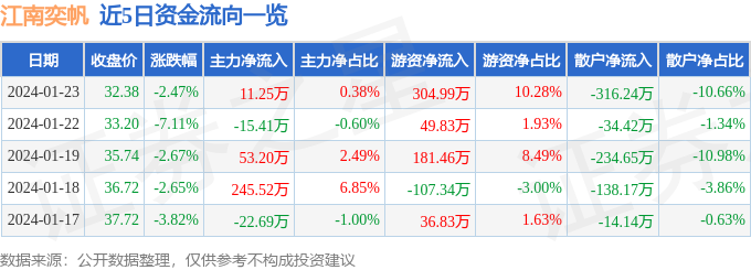 江南奕帆(301023)1月23日主力资金净买入11.25万元