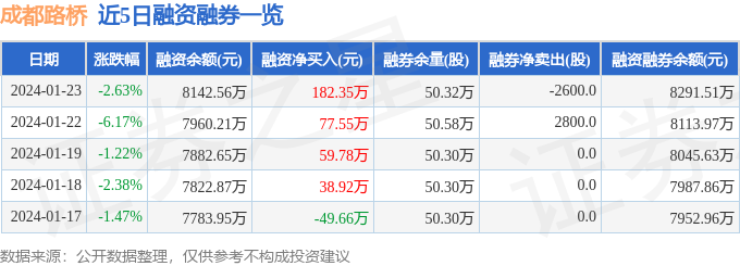 成都路桥融资融券信息显示,融资方面,当日融资买入302.77万元,融资偿还120.41万元,融资净买入182.35万元,连续3日净买入累计319.69万元。融券方面,融券卖出0.0股,融券偿还2600.0股,融券余量50.32万股,融券余额148.95万元。融资融券余额8291.51万元。近5日融资融券数据一览见下表: