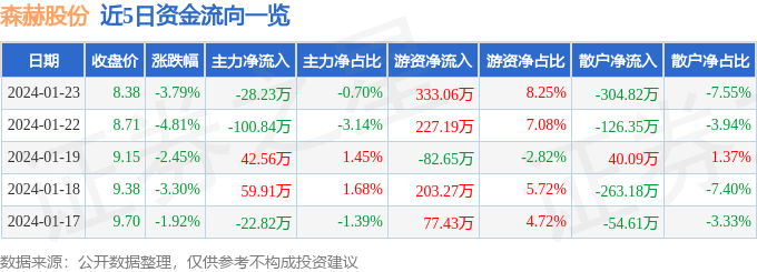 财经消息,截至2024年1月23日收盘,森赫股份(301056)报收于8.38元,下跌3.79%,换手率7.2%,成交量4.8万手,成交额4038.88万元。
