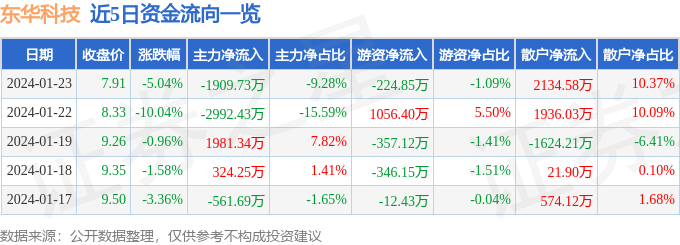 财经消息,截至2024年1月23日收盘,东华科技(002140)报收于7.91元,下跌5.04%,换手率4.92%,成交量26.47万手,成交额2.06亿元。