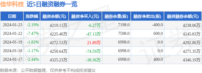佳华科技融资融券信息显示,融资方面,当日融资买入87.19万元,融资偿还93.45万元,融资净偿还6.27万元。融券方面,融券卖出0.0股,融券偿还400.0股,融券余量7198.0股,融券余额18.93万元。融资融券余额4238.06万元。近5日融资融券数据一览见下表:
