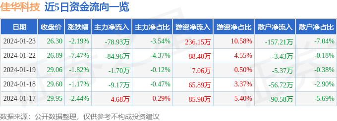 财经消息,截至2024年1月23日收盘,佳华科技(688051)报收于26.3元,下跌2.19%,换手率1.09%,成交量8439.0手,成交额2231.6万元。