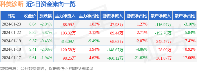 科美诊断(688468)1月23日主力资金净买入68.99万元