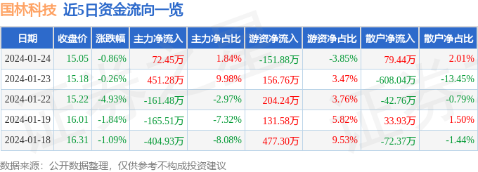 1月24日的资金流向数据方面,主力资金净流入72.45万元,占总成交额1.84%,游资资金净流出151.88万元,占总成交额3.85%,散户资金净流入79.44万元,占总成交额2.01%。