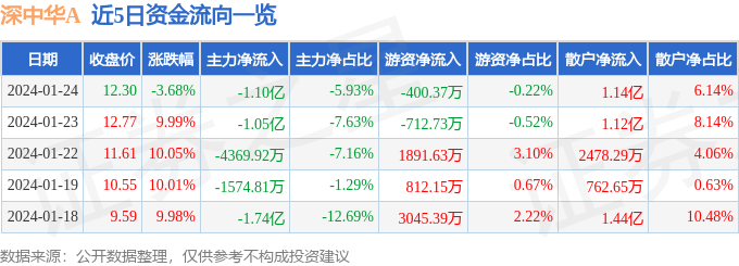 深中华A(000017)1月24日主力资金净卖出1.10亿元