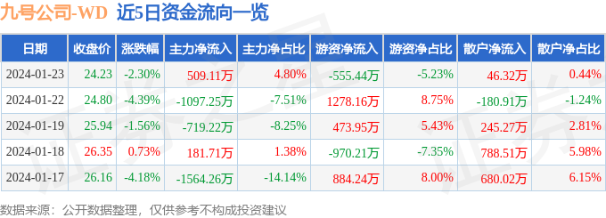 九号公司(689009)1月23日主力资金净买入509.11万元