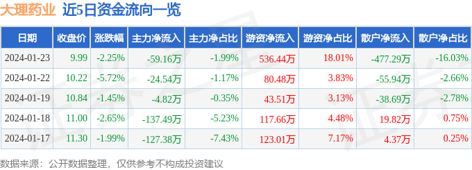 大理药业(603963)1月23日主力资金净卖出59.16万元