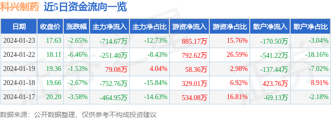财经消息,截至2024年1月23日收盘,科兴制药(688136)报收于17.63元,下跌2.65%,换手率1.59%,成交量3.17万手,成交额5614.99万元。