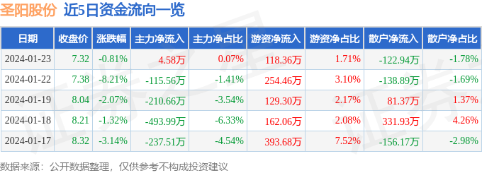 财经消息,截至2024年1月23日收盘,圣阳股份(002580)报收于7.32元,下跌0.81%,换手率2.1%,成交量9.52万手,成交额6917.61万元。