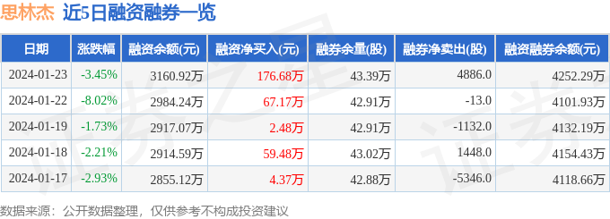 思林杰融资融券信息显示,融资方面,当日融资买入344.21万元,融资偿还167.53万元,融资净买入176.68万元,连续3日净买入累计246.33万元。融券方面,融券卖出7786.0股,融券偿还2900.0股,融券余量43.39万股,融券余额1091.37万元。融资融券余额4252.29万元。近5日融资融券数据一览见下表: