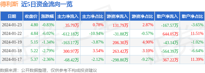 股票行情快报:得利斯(002330)1月23日主力资金净买入35.79万元