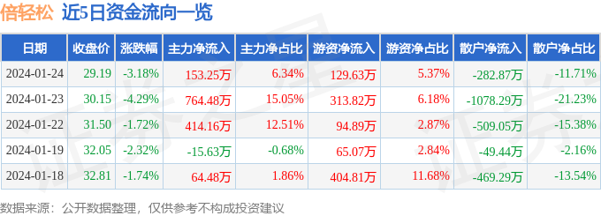 1月24日的资金流向数据方面,主力资金净流入153.25万元,占总成交额6.34%,游资资金净流入129.63万元,占总成交额5.37%,散户资金净流出282.87万元,占总成交额11.71%。