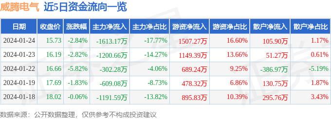 威腾电气(688226)1月24日主力资金净卖出1613.17万元