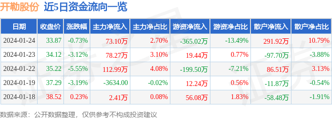 开勒股份(301070)1月24日主力资金净买入73.10万元