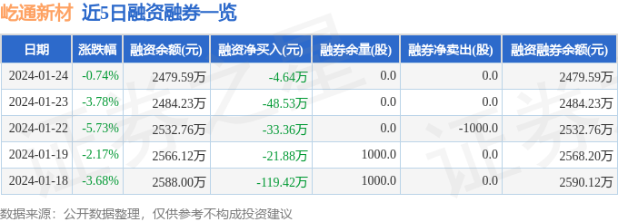 屹通新材融资融券信息显示,融资方面,当日融资买入44.15万元,融资偿还48.79万元,融资净偿还4.64万元。融券方面,融券卖出0.0股,融券偿还0.0股,融券余量0.0股,融券余额0.0万元。融资融券余额2479.59万元。近5日融资融券数据一览见下表: