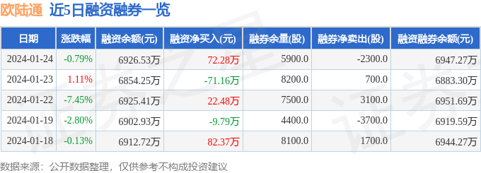 欧陆通融资融券信息显示,融资方面,当日融资买入231.61万元,融资偿还159.33万元,融资净买入72.28万元。融券方面,融券卖出200.0股,融券偿还2500.0股,融券余量5900.0股,融券余额20.74万元。融资融券余额6947.27万元。近5日融资融券数据一览见下表: