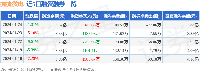 捷捷微电融资融券信息显示,融资方面,当日融资买入1482.68万元,融资偿还1336.05万元,融资净买入146.63万元。融券方面,融券卖出6.4万股,融券偿还28.46万股,融券余量109.57万股,融券余额1608.46万元。融资融券余额3.84亿元。近5日融资融券数据一览见下表: