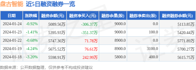 盘古智能融资融券信息显示,融资方面,当日融资买入195.43万元,融资偿还501.8万元,融资净偿还306.37万元。融券方面,融券卖出0.0股,融券偿还0.0股,融券余量9000.0股,融券余额24.28万元。融资融券余额5113.85万元。近5日融资融券数据一览见下表: