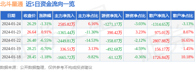 财经消息,截至2024年1月24日收盘,北斗星通(002151)报收于26.29元,下跌1.31%,换手率3.68%,成交量16.25万手,成交额4.2亿元。