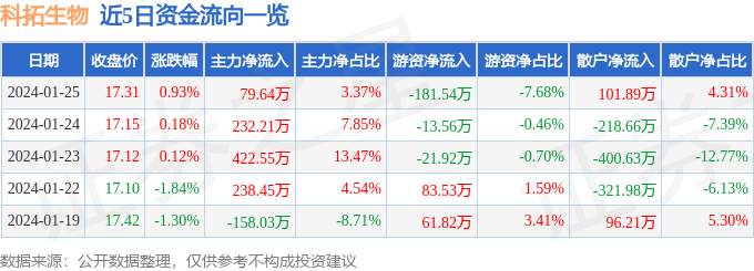 科拓生物(300858)1月25日主力资金净买入79.64万元