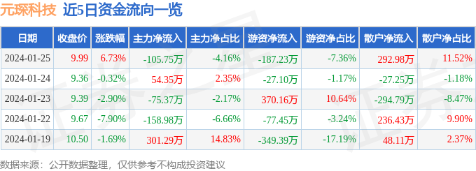 1月25日的资金流向数据方面,主力资金净流出105.75万元,占总成交额4.16%,游资资金净流出187.23万元,占总成交额7.36%,散户资金净流入292.98万元,占总成交额11.52%。