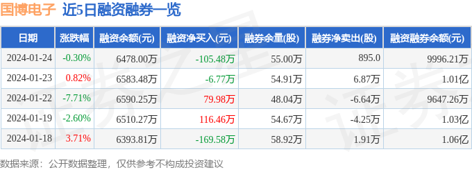 国博电子融资融券信息显示,融资方面,当日融资买入159.32万元,融资偿还264.79万元,融资净偿还105.48万元。融券方面,融券卖出3.76万股,融券偿还3.67万股,融券余量55.0万股,融券余额3518.2万元。融资融券余额9996.21万元。近5日融资融券数据一览见下表: