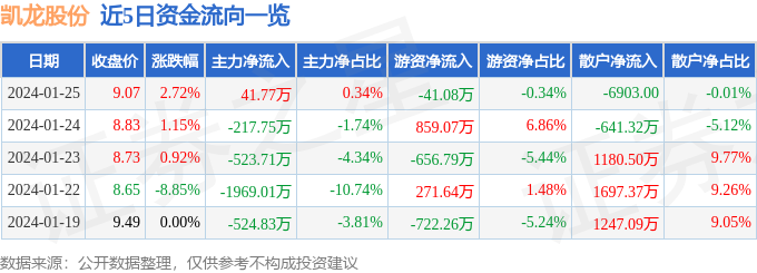 股票行情快报:凯龙股份(002783)1月24日主力资金净卖出217.75万元