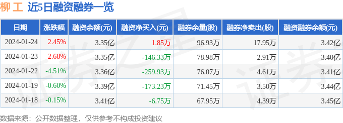 柳 工融资融券信息显示,融资方面,当日融资买入353.59万元,融资偿还351.75万元,融资净买入1.85万元。融券方面,融券卖出20.85万股,融券偿还2.9万股,融券余量96.93万股,融券余额647.5万元。融资融券余额3.42亿元。近5日融资融券数据一览见下表: