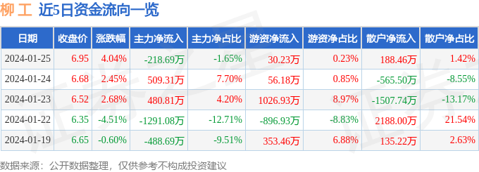 股票行情快报:柳工(000528)1月24日主力资金净买入509.31万元