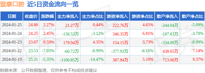 股票行情快报:登康口腔(001328)1月24日主力资金净卖出158.53万元