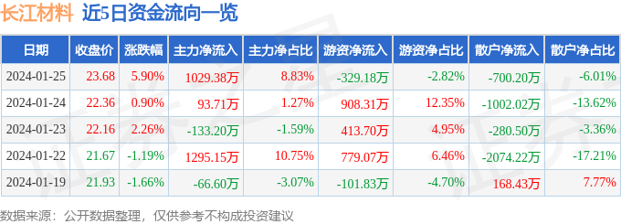 股票行情快报:长江材料(001296)1月25日主力资金净买入1029.38万元