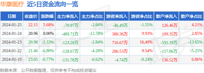 股票行情快报:华康医疗(301235)1月25日主力资金净卖出79.97万元