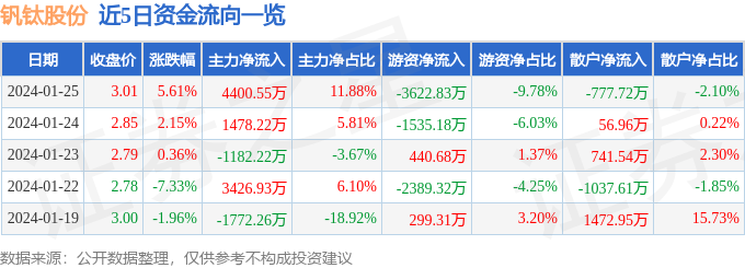 财经消息,截至2024年1月25日收盘,钒钛股份(000629)报收于3.01元,上涨5.61%,换手率1.37%,成交量125.7万手,成交额3.7亿元。