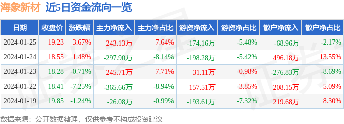 股票行情快报:海象新材(003011)1月25日主力资金净买入243.13万元