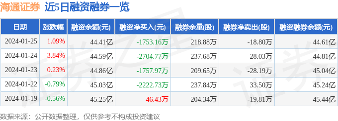 海通证券融资融券信息显示,融资方面,当日融资买入4984.85万元,融资偿还6738.01万元,融资净偿还1753.16万元。融券方面,融券卖出17.22万股,融券偿还36.02万股,融券余量218.88万股,融券余额2035.58万元。融资融券余额44.61亿元。近5日融资融券数据一览见下表: