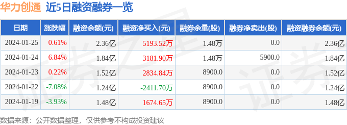华力创通融资融券信息显示,融资方面,当日融资买入9071.67万元,融资偿还3878.15万元,融资净买入5193.52万元,连续3日净买入累计1.12亿元。融券方面,融券卖出0.0股,融券偿还0.0股,融券余量1.48万股,融券余额29.3万元。融资融券余额2.36亿元。近5日融资融券数据一览见下表: