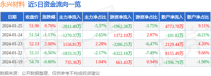 永兴材料(002756)1月25日主力资金净卖出2811.40万元