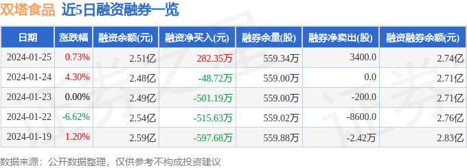 双塔食品融资融券信息显示,融资方面,当日融资买入425.24万元,融资偿还142.89万元,融资净买入282.35万元。融券方面,融券卖出3400.0股,融券偿还0.0股,融券余量559.34万股,融券余额2321.26万元。融资融券余额2.74亿元。近5日融资融券数据一览见下表: