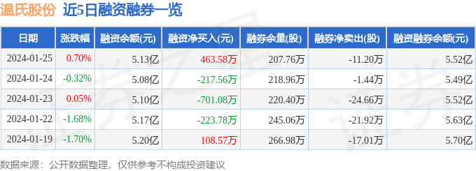 温氏股份融资融券信息显示,融资方面,当日融资买入1400.01万元,融资偿还936.43万元,融资净买入463.58万元。融券方面,融券卖出4.41万股,融券偿还15.61万股,融券余量207.76万股,融券余额3910.03万元。融资融券余额5.52亿元。近5日融资融券数据一览见下表: