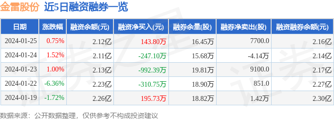 金雷股份融资融券信息显示,融资方面,当日融资买入1300.45万元,融资偿还1156.65万元,融资净买入143.8万元。融券方面,融券卖出3.19万股,融券偿还2.42万股,融券余量16.45万股,融券余额355.32万元。融资融券余额2.16亿元。近5日融资融券数据一览见下表: