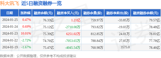 科大讯飞融资融券信息显示,融资方面,当日融资买入4.18亿元,融资偿还2.96亿元,融资净买入1.21亿元,净买入额两市排名第4。融券方面,融券卖出41.11万股,融券偿还74.96万股,融券余量759.97万股,融券余额3.24亿元。融资融券余额79.57亿元。近5日融资融券数据一览见下表: